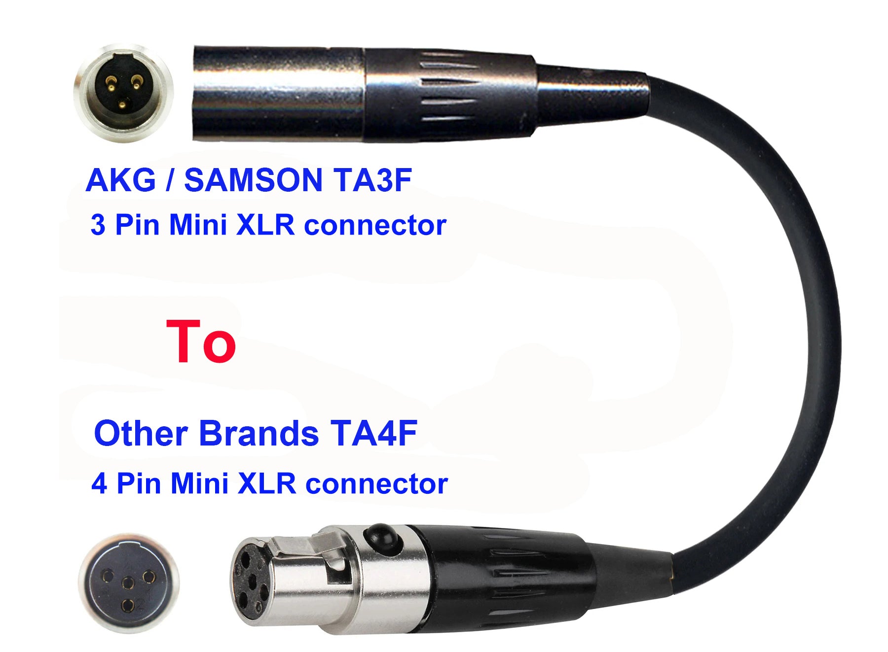 This microphone adapter can convert your AKG / Samson Headset / Ear Hook / Lavaliere / Handheld condenser Microphone with 3 pin mini XLR connector TO work with Other Brands transmitters with 4 pin TA4M connector.