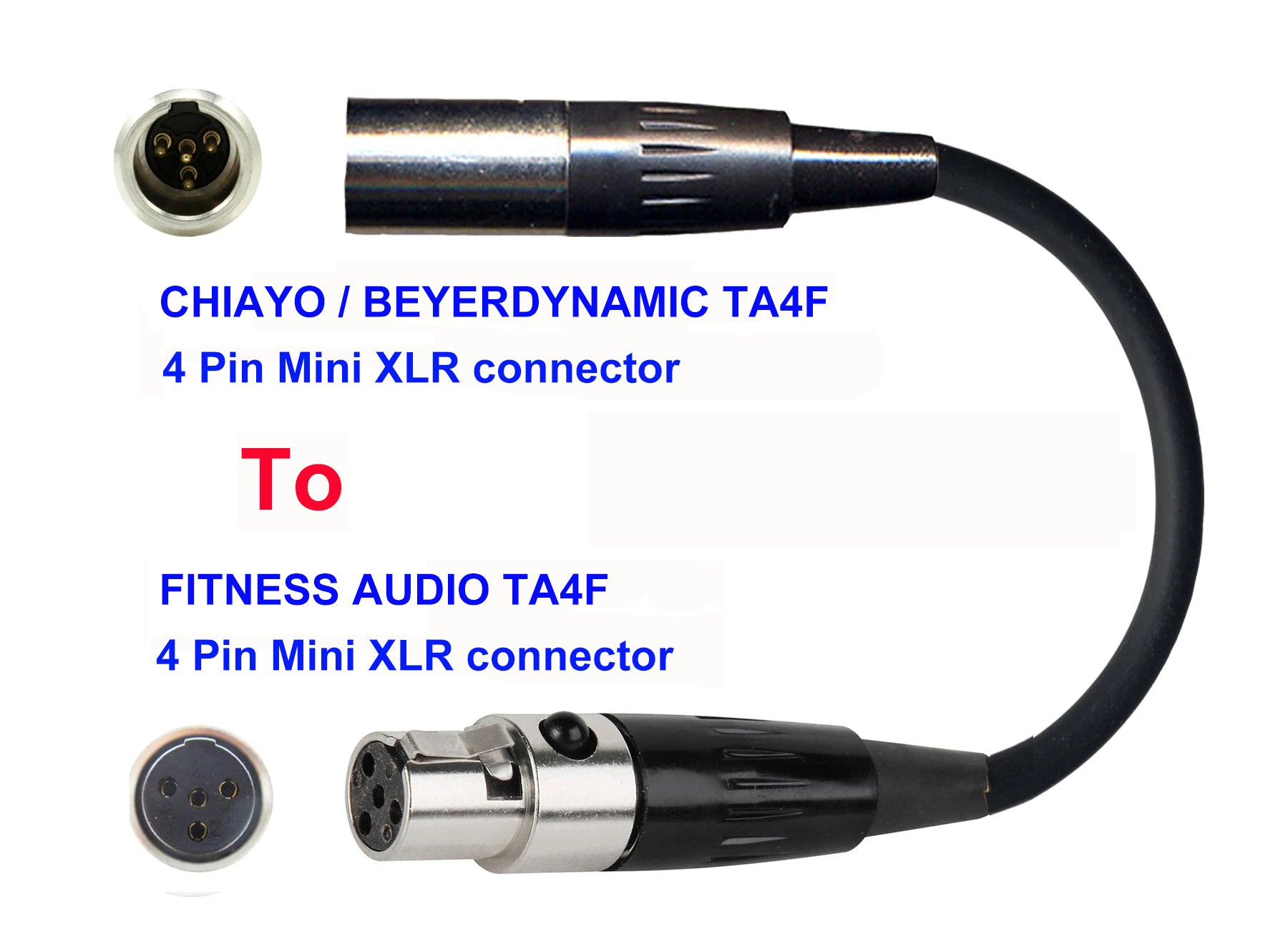 This microphone adapter can convert your Chiayo / JTS / Line6 / Beyerdynamic Headset / Ear Hook / Lavaliere / Handheld condenser Microphone with 4 pin mini XLR connector TO work with Fitness Audio transmitters with 4 pin TA4M connector.