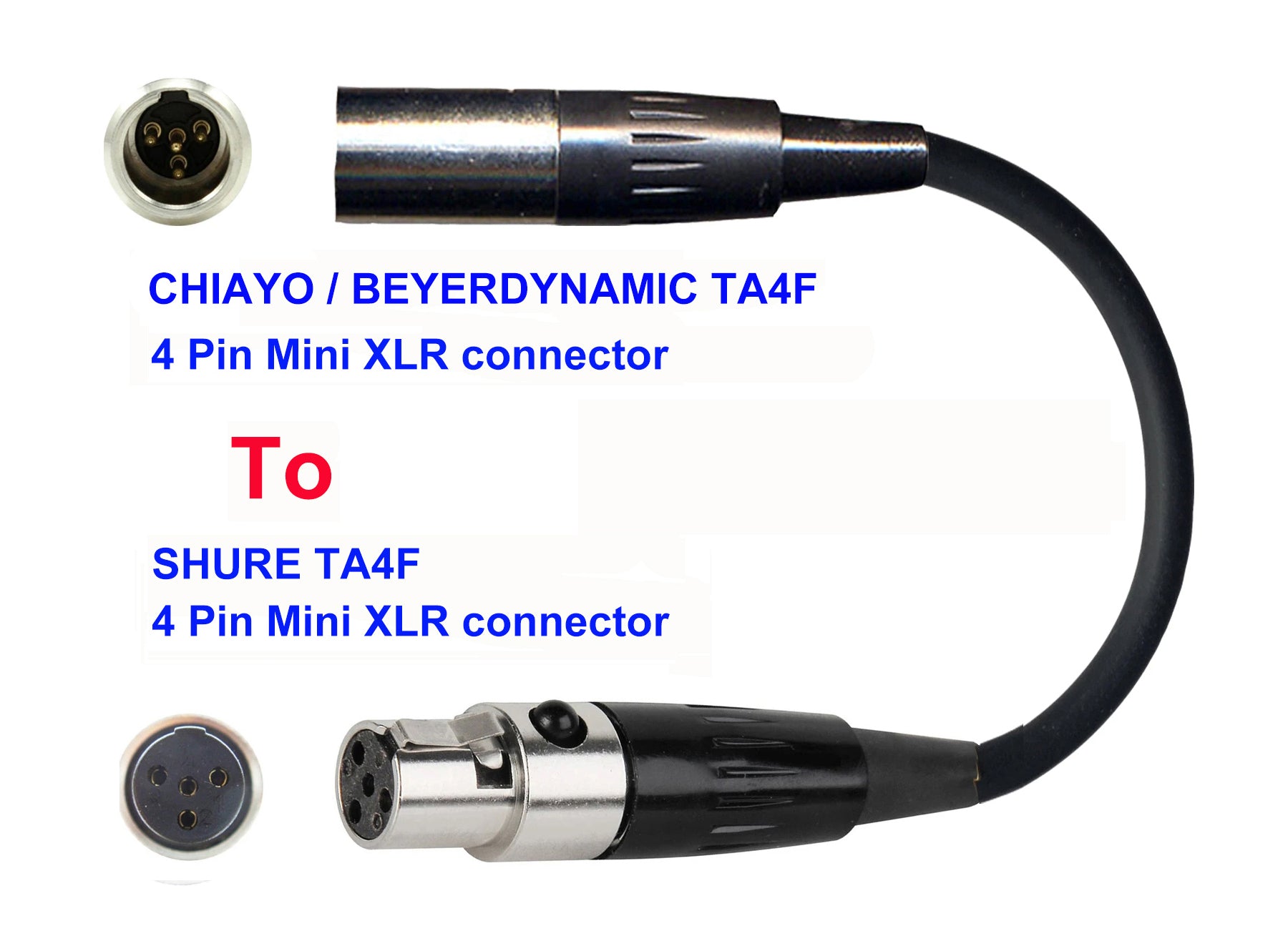 This microphone adapter can convert your Chiayo / JTS / Line6 / Beyerdynamic Headset / Ear Hook / Lavaliere / Handheld condenser Microphone with 4 pin mini XLR connector TO work with Shure transmitters with 4 pin TA4M connector.