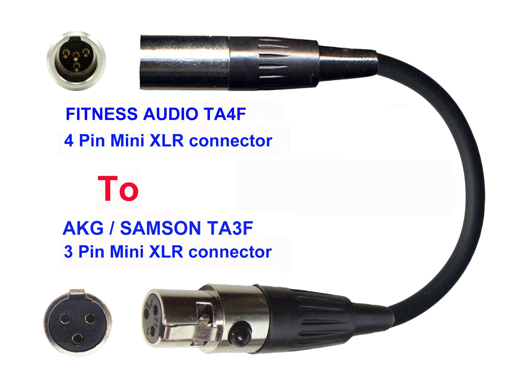 Microphone Adapter - Fitness Audio / Aeromic / Emic Microphones with TA4F 4 pin mini XLR connector TO AKG / Samson Transmitters with 3 pin TA3M connector