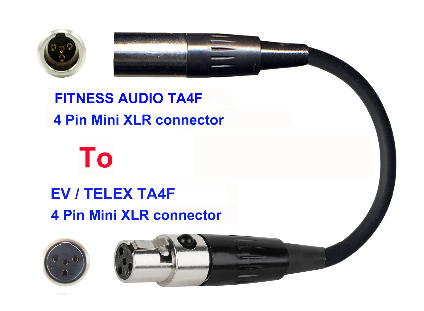 Microphone Adapter - Fitness Audio / Aeromic / Emic Microphones with TA4F 4 pin mini XLR connector TO EV / Telex Transmitters with 4pin TA4M connector