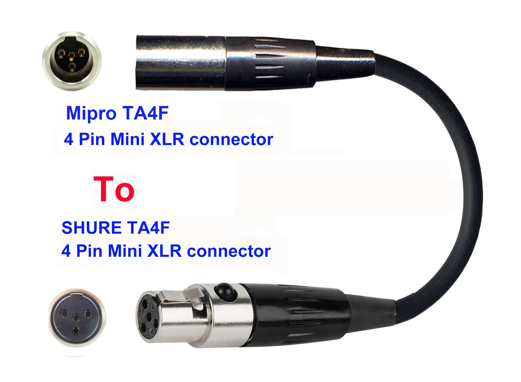 This microphone adapter can convert your Mipro Headset / Ear Hook / Lavaliere / Handheld condenser Microphone with 4 pin mini XLR Locking connector TO work with Shure transmitters with 4 pin TA4M connector.