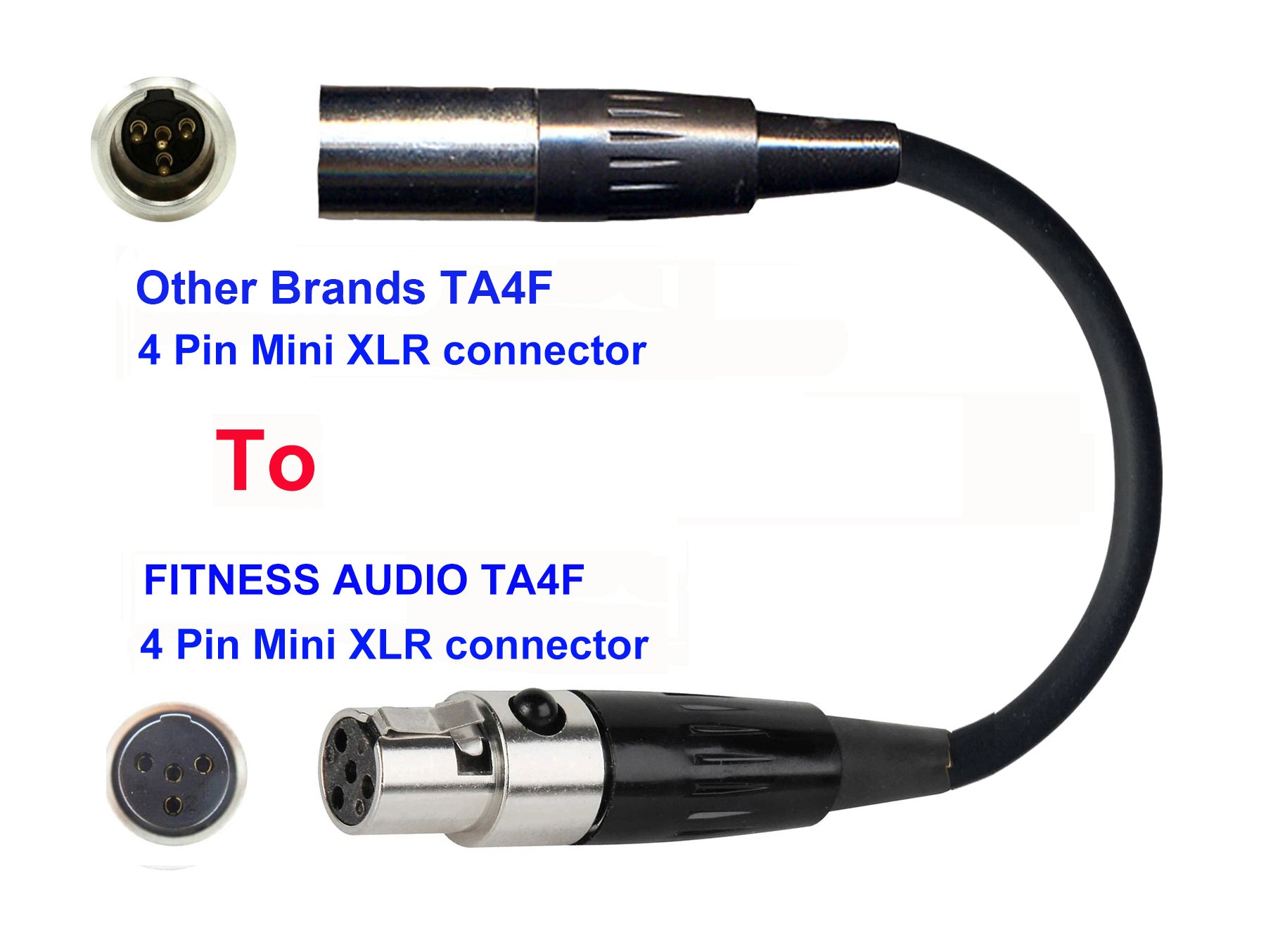 This microphone adapter can convert your Other Brands Headset / Ear Hook / Lavaliere / Handheld condenser Microphone with 4 pin mini XLR connector TO work with Fitness Audio transmitters with 4 pin TA4M connector.