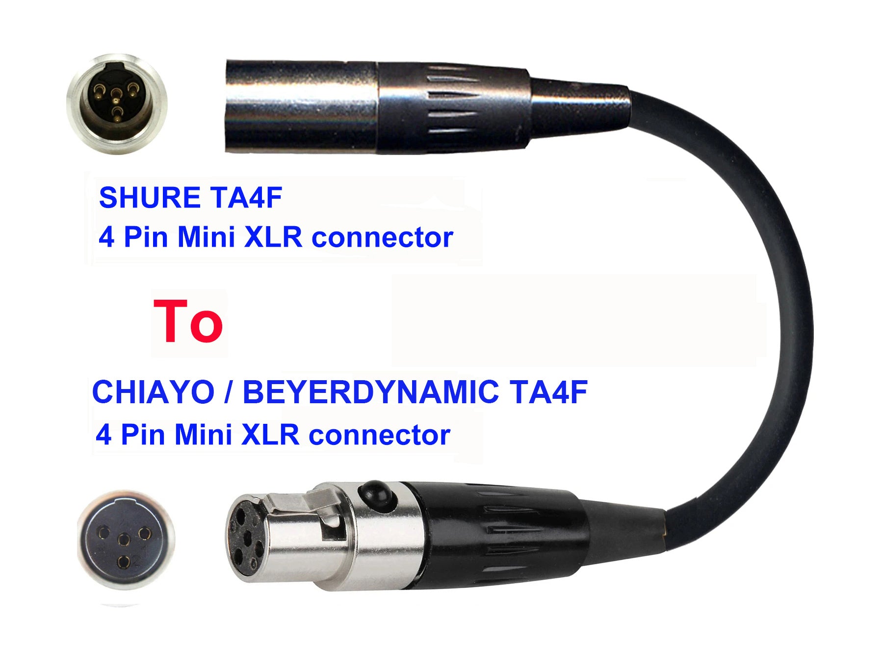 Microphone Adapter - Shure Microphones with TA4F 4 pin mini XLR connector TO Chiayo / JTS / Line6 / Beyerdynamic Transmitters with 4 pin TA4M connector