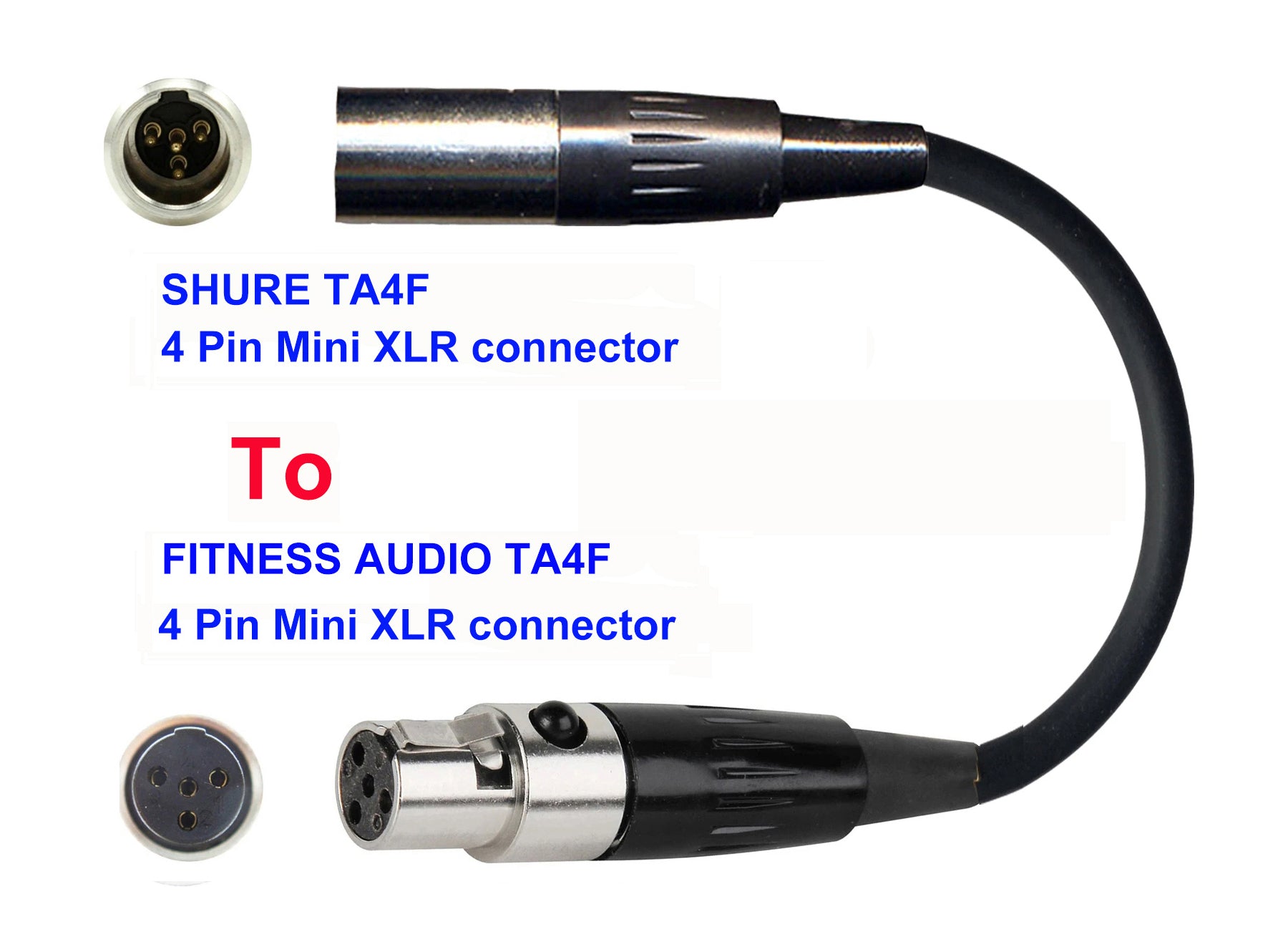 This microphone adapter can convert your Shure Headset / Ear Hook / Lavaliere / Handheld condenser Microphone with 4 pin mini XLR connector TO work with Fitness Audio transmitters with 4 pin TA4M connector.