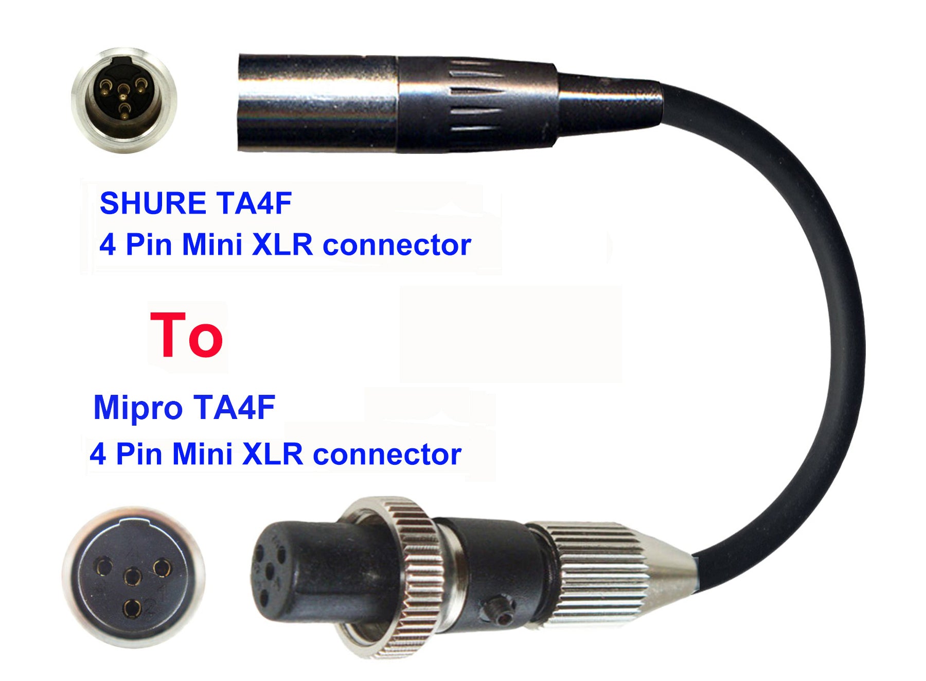 Microphone Adapter - Shure Microphones with TA4F 4 pin mini XLR connector TO Mipro Transmitters with 4 Pin TA4M Locking connector
