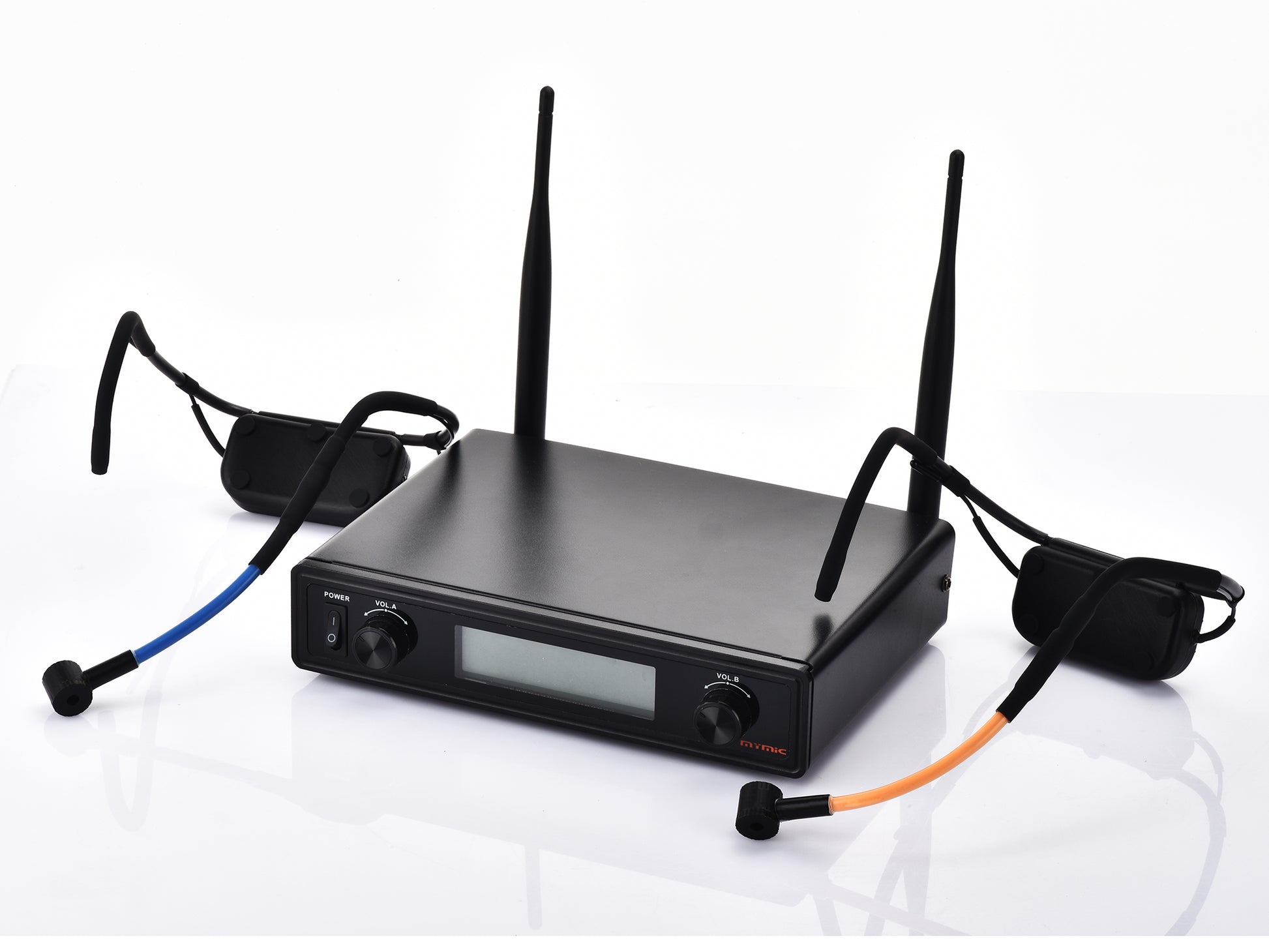 Mymic cordless headset provides up to 100 meters transmission range. The Wireless Receiver provides 24-48(Region dependent) channels with PLL Frequency digital synthesis for interference-free performance. For fast setup, Infrared setup technology wirelessly matches the channel of the transmitter to the receiver. The receiver's True Diversity design minimizes dropouts while tone key technology prevents unwanted noise when your transmitter is off or out of range.